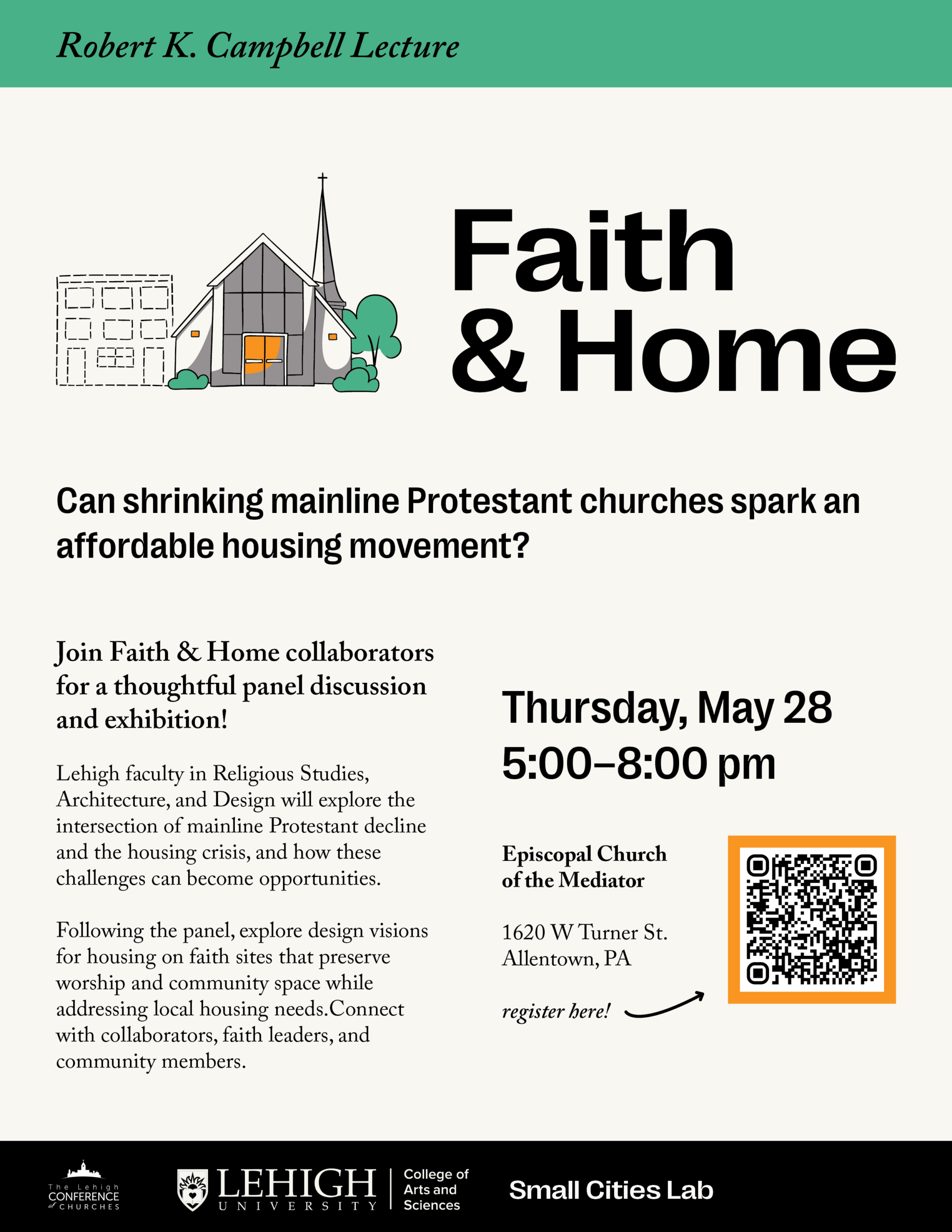 About This Event Faith & Home: Can declining mainline Protestant churches cause an affordable housing movement? Join Faith & Home collaborators for a thoughtful panel discussion and exhibition! Lehigh faculty in Religious Studies, Architecture, and Design will explore the intersection of mainline Protestant decline and the housing crisis, and how these challenges can become opportunities.…