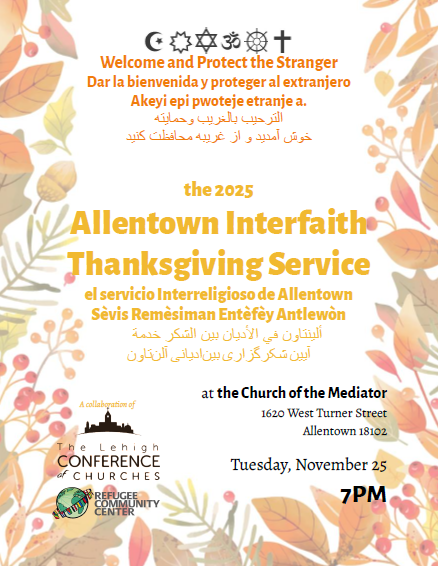 Interfaith Thanksgiving Service, "Embracing the Stranger, Give Thanks and Provide" Tuesday, November 25, 7:00 p.m., hosted by the Episcopal Church of the Mediator and Refugee Community Center, 1620 W. Turner St., Allentown, PA 18102. Parking is available at the Masonic Temple lot on Linden St. by 16th St. Everyone is invited to bring non-perishable…